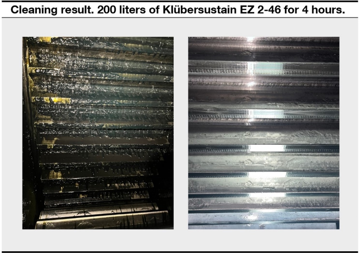 Tuotannon korkea käyntiaste on yrityksille ensiarvoisen tärkeää, ja voiteluaineen vaihtaminen voi olla aikaa vievää ja kallista. Tätä varten Klüber Lubrication on kehittänyt markkinoille voitelevan pesuaineen Klübersustain EZ 2-46. Tuote mahdollistaa voiteluaineen vaihdon muutamassa tunnissa, kun perinteinen manuaalinen kehän puhdistus voi kestää 2-3 työntekijältä viisi päivää ja vaatii aina koneen alasajon. Klübersustain EZ 2-46 toimii koneen käydessä täydellä kuormalla, joten tuotantoa ei tarvitse keskeyttää puhdistuksen ajaksi. Pesuprosessi on turvallinen, tehokas ja ympäristöystävällinen, eikä ylimääräisiä seisokkeja tarvita. Lisäksi pesuaine on biohajoava ja valmistettu yli 70% uusiutuvista raaka-aineista. Alla olevassa kuvassa näkyy sementtitehtaan myllyllä neljässä tunnissa saavutettu pesutulos yhdellä 200 litran tynnyrillä.