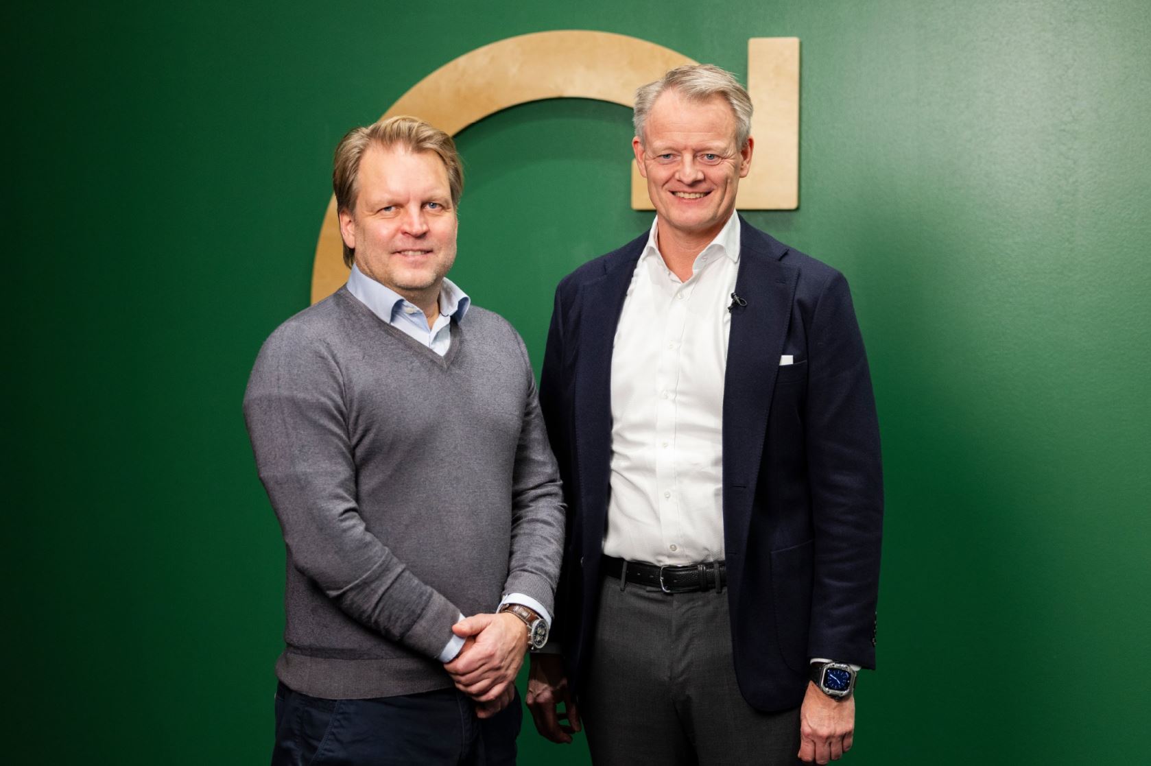Caverion Suomen toimitusjohtajan Ville Tamminen (vas.) vierellään Assemblin Caverion Groupin hallituksen puheenjohtaja Jacob Götzsche.