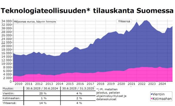 Uusien tilausten ja tilauskantojen tilanne on edelleen melko heikko, mutta kauppasodan uhka ei päässyt taittamaan suhdannetta takaisin kohti heikompaa. Uusien tilausten arvo oli huhti–kesäkuussa viisi prosenttia suurempi kuin edellisellä neljänneksellä ja viisitoista prosenttia suurempi kuin vuoden 2024 vastaavalla ajanjaksolla. Tilauskannan arvo oli kesäkuun lopussa neljä prosenttia suurempi kuin maaliskuun lopussa ja neljätoista prosenttia suurempi kuin samaan aikaan vuosi sitten.